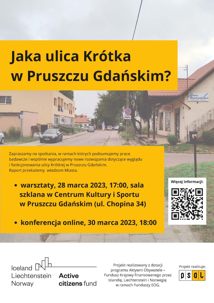 W imieniu realizatora projektu, Pomorskiego Stowarzyszenia Aktywni Lokalnie, zapraszamy na spotkania dotyczące wyglądu i funkcjonowania ulicy Krótkiej w Pruszczu Gdańskim. Spotkania podsumują dotychczasowe prace badawcze i będą przestrzenią do wspólnego wypracowania nowych rozwiązań. Raport zostanie przekazany władzom Miasta.