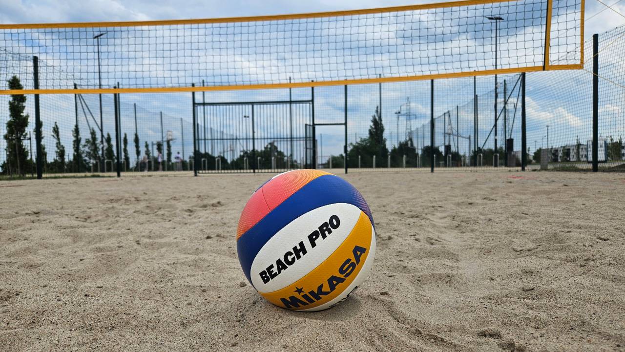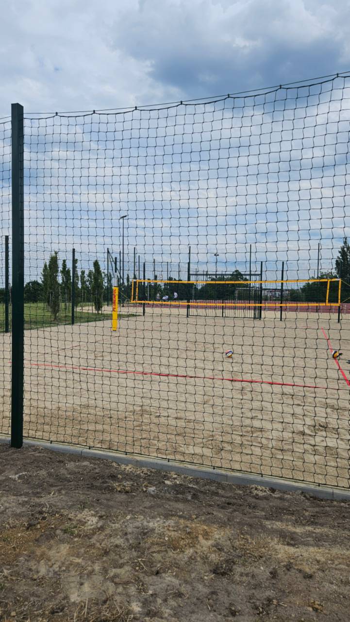 Boisko do siatkówki plażowej wraz z ogrodzeniem.
