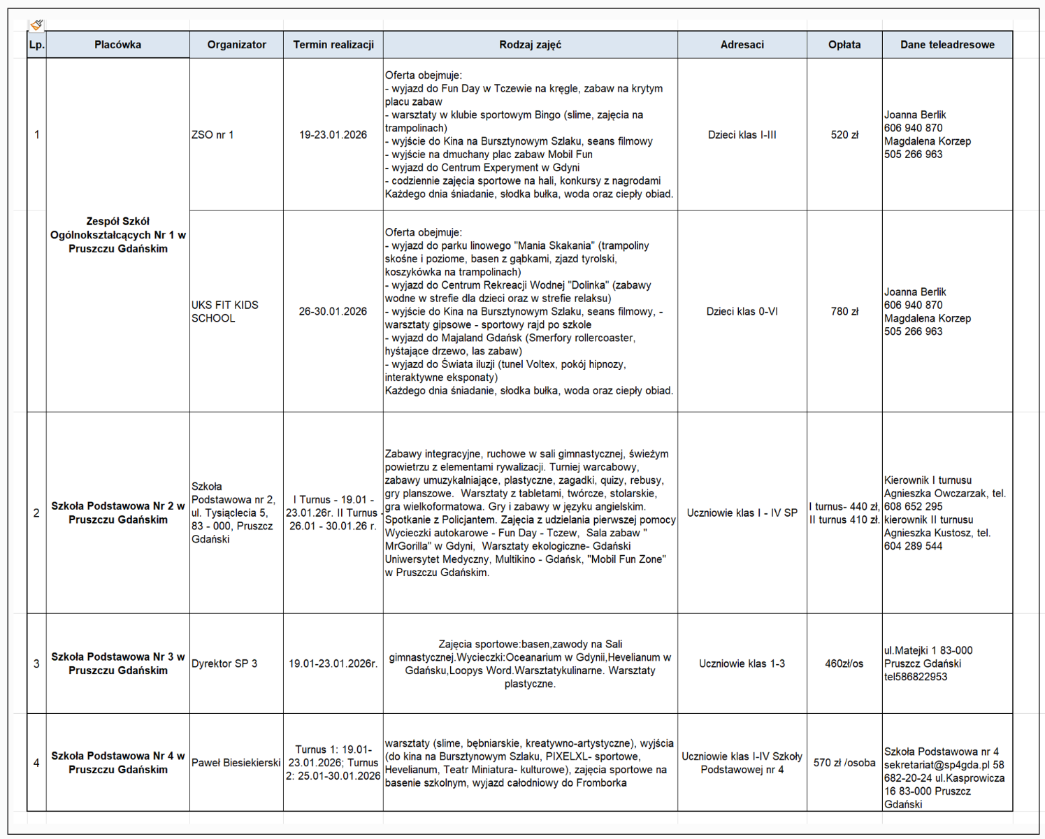 Szczegółowy harmonogram dla każdej szkoły, terminy turnusów, cennik oraz dane kontaktowe do zapisów znajdują się w tabeli: TUTAJ